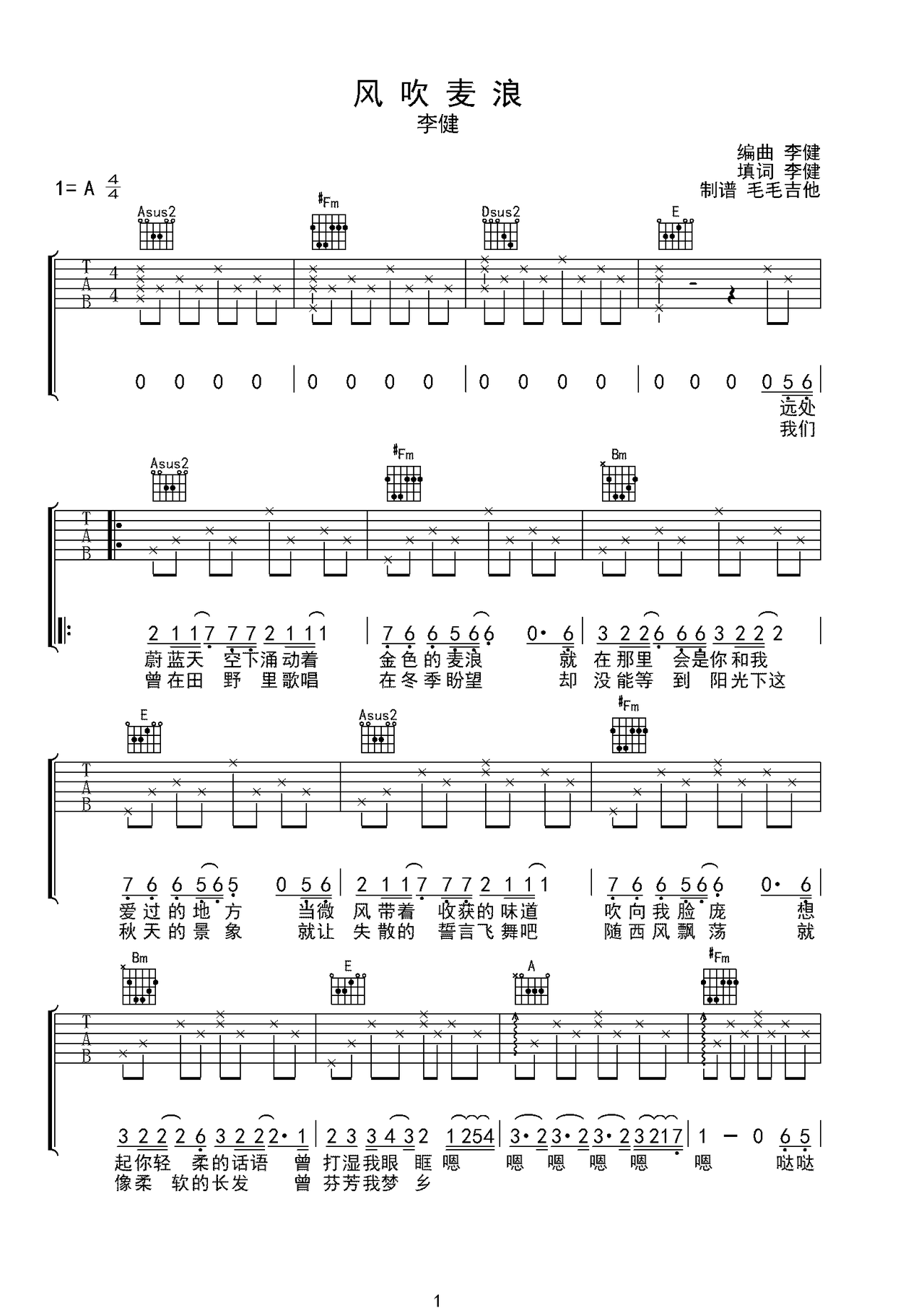 演唱:李健 制谱:西安毛毛吉他 A调