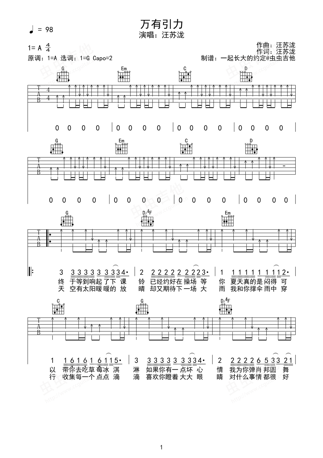 万有引力吉他谱-弹唱谱-a调-虫虫吉他