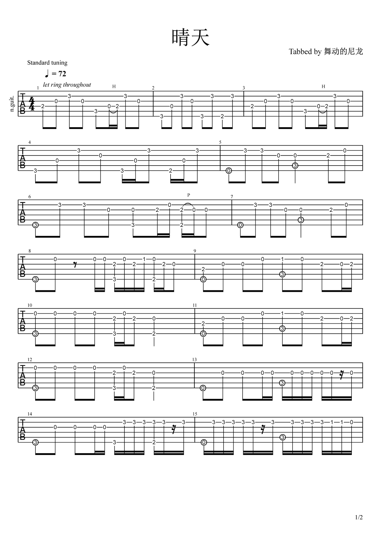 晴天吉他谱-指弹谱-g调-虫虫吉他