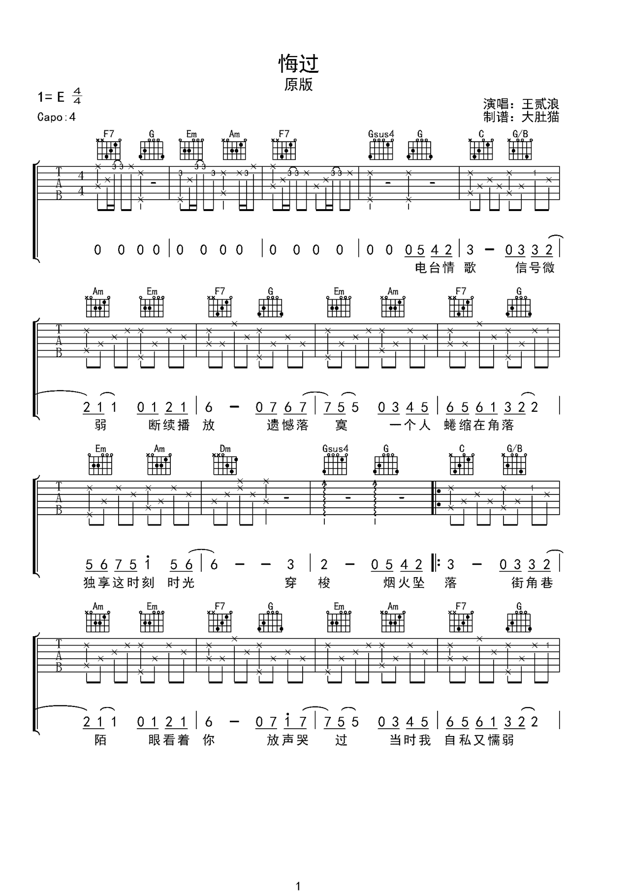 悔过吉他谱-弹唱谱-e大调-虫虫吉他