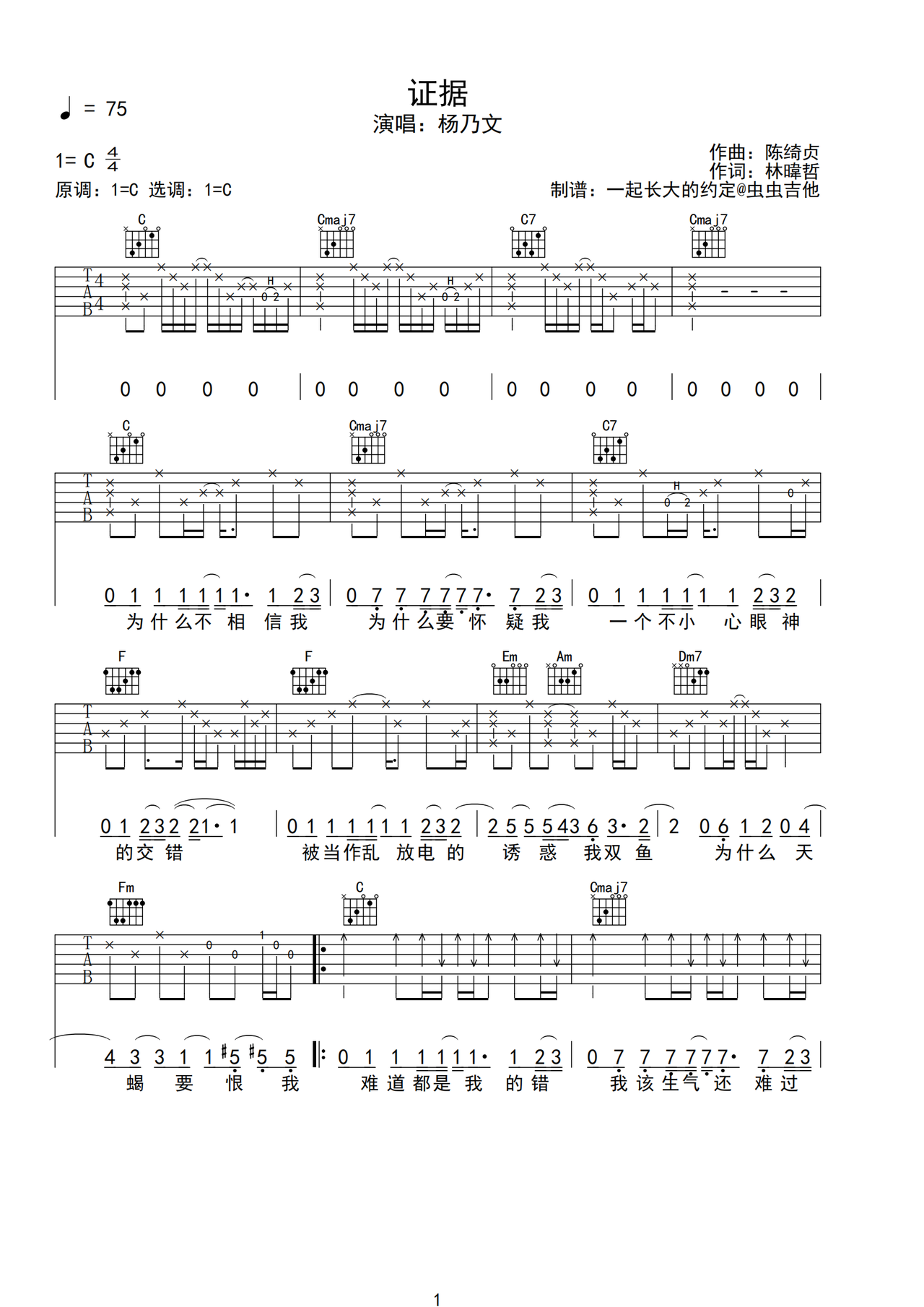 证据吉他谱-弹唱谱-c调-虫虫吉他